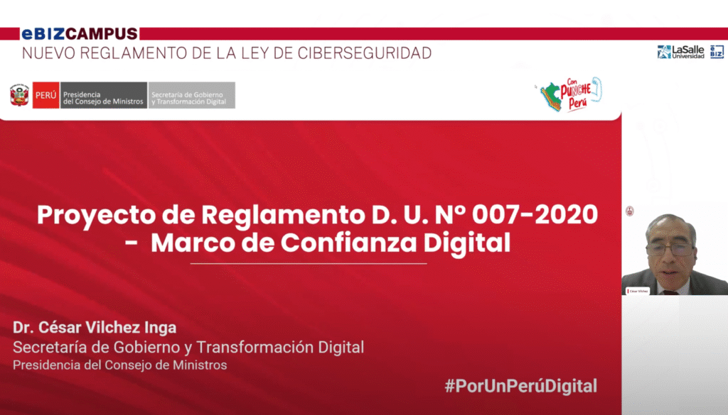 En este nuevo eBIZ CAMPUS, el secretario de la Secretaría de Gobierno y Transformación Digital, César Vílchez, analiza en exclusiva la propuesta del «Reglamento de la Ley de Seguridad Digital» y su impacto para la ciberseguridad en Perú. En el panel participaron los especialistas Giovanni Pichling de ASBANC, Alfredo Alva de Cloud Security Alliance.