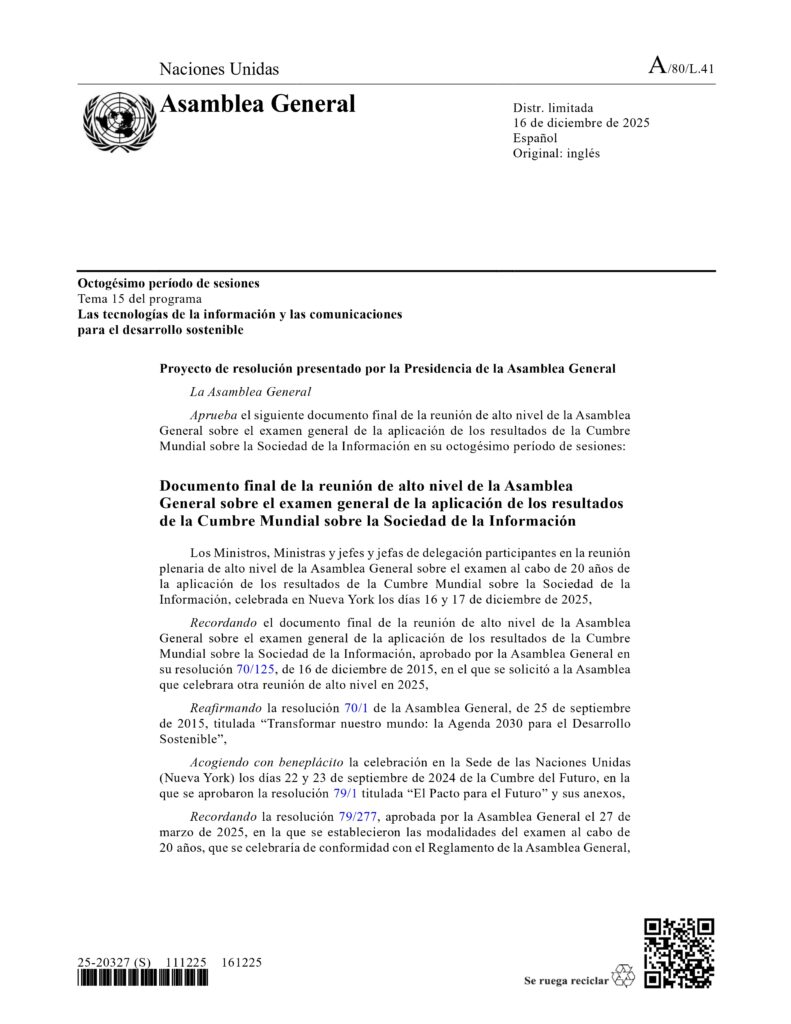 Como conclusión de la reunión celebrada en la sede de la ONU de Nueva York los días 16 y 17 de diciembre de 2025, a dos décadas de la Cumbre Mundial sobre la Sociedad de la Información, se reafirmaron sus principios y se identificaron nuevos retos y oportunidades de la hiperconectividad. Dado que todo esfuerzo requiere ser monitoreado para verificar su cumplimiento y avances, se acordaron evaluaciones cada dos años, una reunión de alto nivel en 2027 para medir el progreso del Pacto Digital Global y una revisión integral programada para 2035.