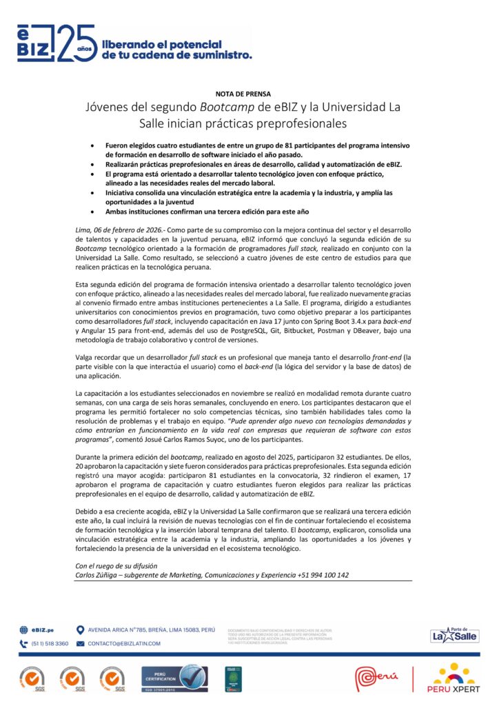 Como parte de su compromiso con la mejora continua del sector y el desarrollo de talentos y capacidades en la juventud peruana, eBIZ informó que concluyó la segunda edición de su Bootcamp tecnológico orientado a la formación de programadores full stack, realizado en conjunto con la Universidad La Salle. Como resultado, se seleccionó a cuatro jóvenes de este centro de estudios para que realicen prácticas en la tecnológica peruana.