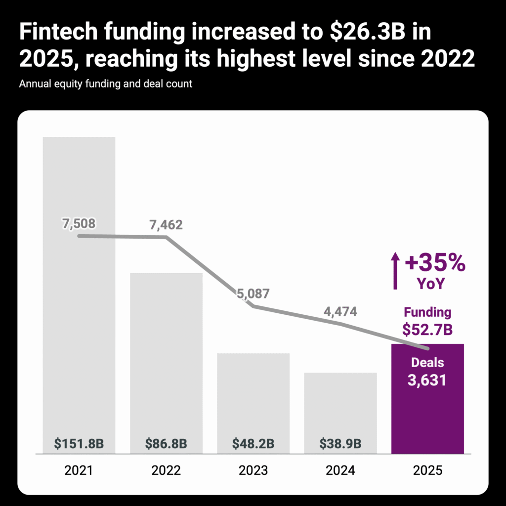 El más reciente reporte de CB Insights reveló que, tras cuatro años consecutivos en descenso, la financiación a empresas fintech aumentó en 2025 hasta los US$52 700 millones, alcanzando su nivel anual más alto desde 2022. Esto se debió en parte a un sólido cuarto trimestre, cuando la financiación alcanzó su nivel más alto desde 2022, con US$16 400 millones.