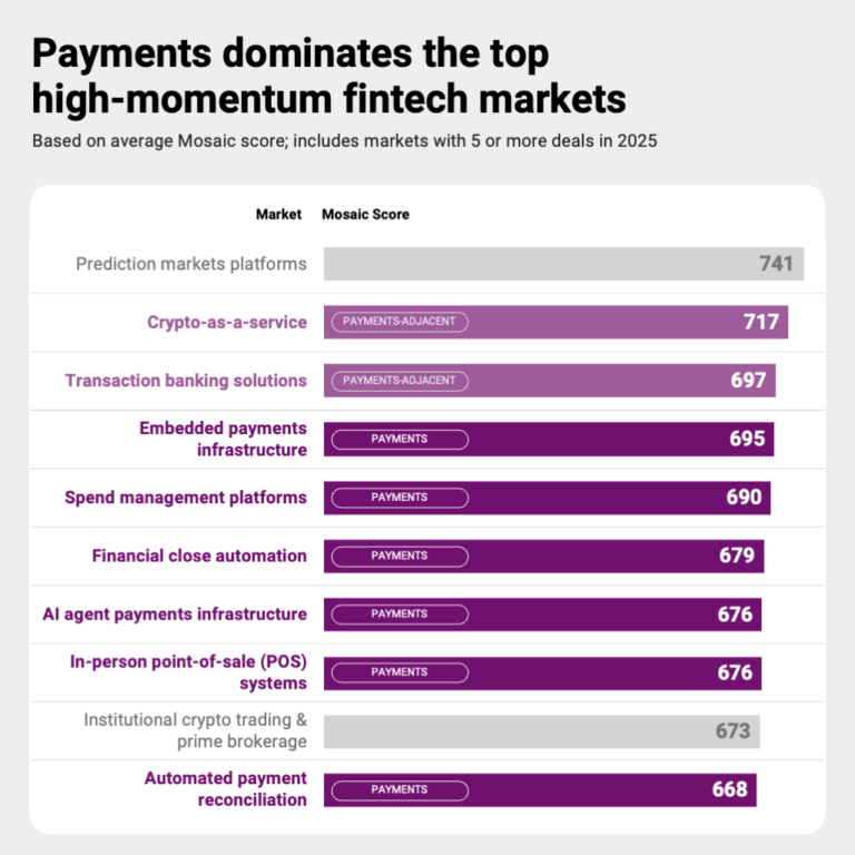 La tecnología de pagos recibió el mayor volumen de transacciones y dólares de financiación tanto en el cuarto trimestre como en 2025 como a lo largo del año, detallaron, superando a banca digital, préstamos digitales, gestión de patrimonios, mercados de capitales y las criptomonedas. Y entre más de 100 mercados de servicios financieros y tecnología blockchain, seis de los 10 principales según la puntuación Mosaic de CB Insights están centrados en los pagos.