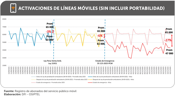 Hasta el tercer trimestre del 2025, según el portal PUNKU del Organismo Supervisor de Inversión Privada en Telecomunicaciones (Osiptel), el mercado de telefonía móvil continuaba con un ritmo ascendente. Sin embargo, luego de que el Osiptel adoptara medidas para frenar venta ambulatoria de chips, en el marco del Estado de Emergencia, se ha evidenciado una reducción en la activación de nuevas líneas. «El riesgo que los vendedores sean arrestados, junto a otras medidas del Ejecutivo, hizo que se redujeran las altas de los servicios», refirió su presidente ejecutivo (e), Jesús Guillén.