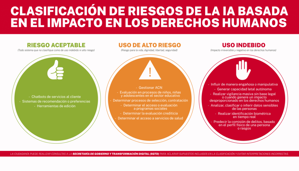 La norma establece tres niveles de riesgo para los sistemas de IA: prohíbe el uso indebido en el caso de impacto irreversible en derechos humanos, como su uso en armas de guerra o vigilancia masiva. Además, se establece el riesgo alto que debe ser controlado por posibles daños significativos, pero reparables, y un riesgo aceptable, de menor impacto, que implica cumplir con ciertas obligaciones.