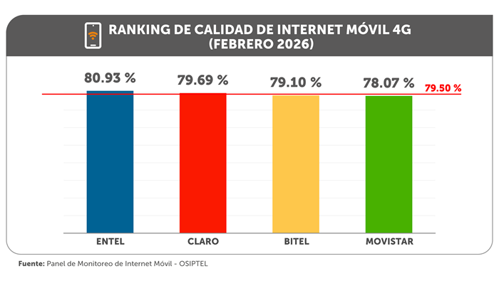 El desempeño del servicio de internet móvil en redes 4G en el Perú alcanzó un promedio de 79,50% en febrero de 2026, informó el Organismo Supervisor de Inversión Pública en Telecomunicaciones (Osiptel). El promedio está ligeramente por encima del 79,47% registrado en enero.